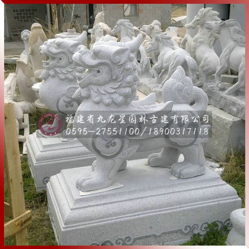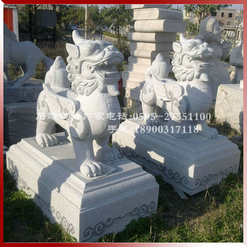 石雕貔貅一般使用各色的大理石制作雕刻而成,目前比較常見的諸如漢白玉、晚霞紅、青石等幾種大理石,并有其他各色的花崗巖石材,雕刻出來以后非常的有氣勢,威武霸氣,各種顏色的貔貅均有著不同的視覺效果表現,配以周邊的建筑,非常的大方美觀。