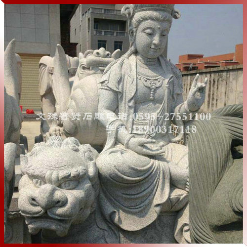 文殊菩薩:大智文殊菩薩右手高舉慧劍,寓意斬?cái)酂馈W笫殖稚?且蓮上通常還有經(jīng)卷