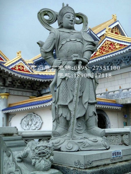 韋馱菩薩像常威武地立于最靠近寺院門口的四天王殿內(nèi),面向寺院,以守護(hù)道場(chǎng)。其形像大多為身穿甲胄的雄壯武將,手持金剛杵,或以杵柱地,或雙手合十,將杵擱于肘間。韋馱菩薩現(xiàn)天大將軍身?yè)?dān)當(dāng)佛教中驅(qū)除邪魔,保護(hù)佛法的重任,為佛教中護(hù)法金剛力士的代表之一.
