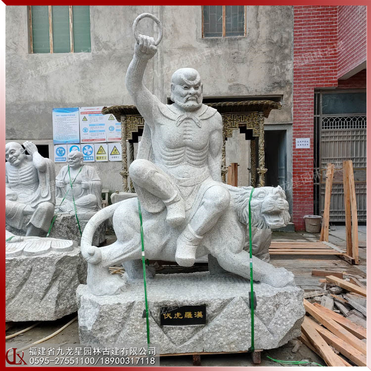 石雕十八羅漢雕塑一般采用天然石材加工制作而成,有花崗巖(芝麻白、芝麻黑、芝麻灰、蝦紅)、青石等,還有的則會用漢白玉石材制作。用于室外擺放石雕十八羅漢像通常建議用花崗巖石材雕刻,按順序擺放在兩側。